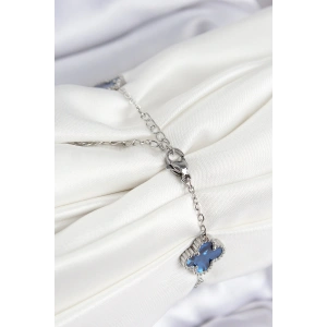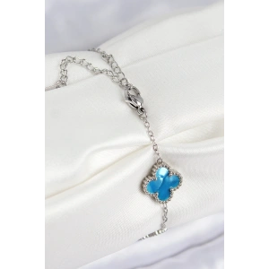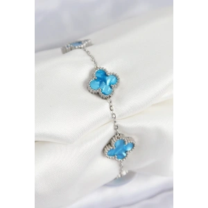 316L Çelik Sedefli Gökyüzü Mavisi Gümüş Renk Yonca Kadın Bileklik