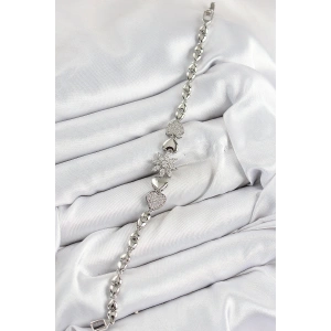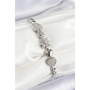 Pirinç Zirkon Taşlı Kalp Detaylı Çiçek Model Gümüş Renk Kadın Bileklik