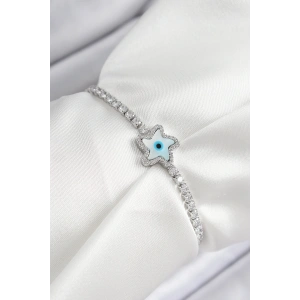 Pirinç Zirkon Taşlı Nazar Yıldız Model Gümüş Renk Asansörlü Kadın Bileklik