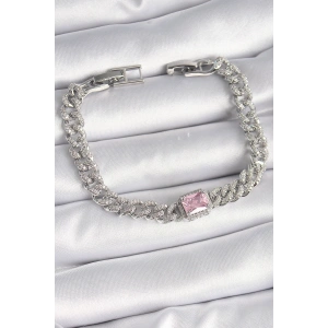 Pirinç Gümüş Renk Pembe Kare Zirkon Taşlı VIP Seri Kadın Bileklik