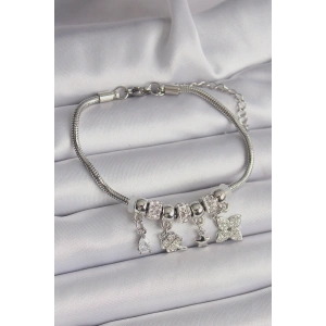 Pirinç Gümüş Renk Zincir Sallantı Zirkon Taşlı Yonca Figür Charm Bileklik