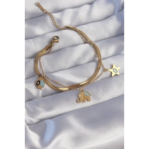 316L Çelik Gold Renk Çift Zincir Çoklu Aksesuarlı Bileklik