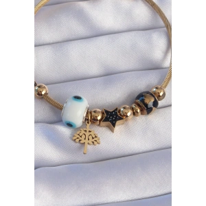 316L Çelik Gold Renk Siyah Zirkon Taşlı Yıldız Tasarımlı Ağaç Detay Nazarlı Charm Bileklik