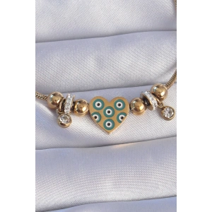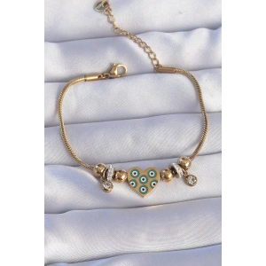 316L Çelik Gold Renk Zirkon Taşlı Nazarlı Kalp Tasarımlı Bileklik