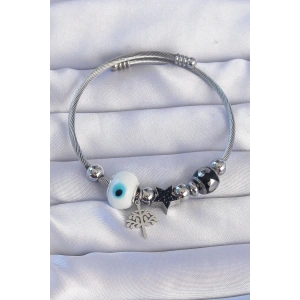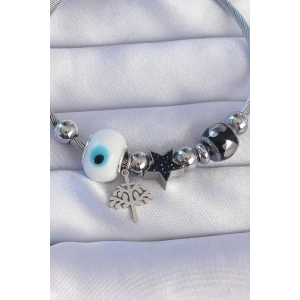316L Çelik Gümüş Renk Siyah Zirkon Taşlı Yıldız Tasarımlı Ağaç Detay Nazarlı Charm Bileklik