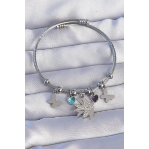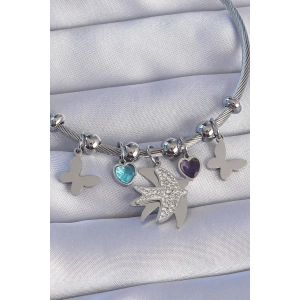 316L Çelik Gümüş Renk Zirkon Taşlı Kuş Tasarımlı Kelebek Detay Charm Bileklik