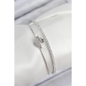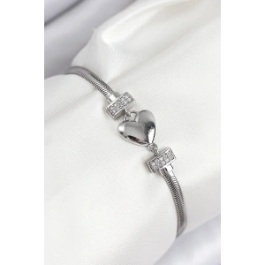 Pirinç Zirkon Taşlı Kalp Model Gümüş Renk Kadın Bileklik