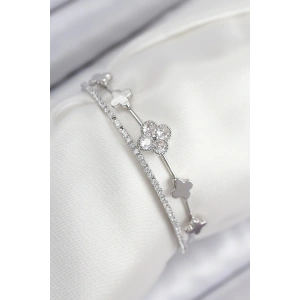 Pirinç Zirkon Taşlı Yonca Model Gümüş Renk Kadın Bileklik