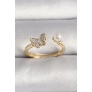 Pirinç Gold Renk Zirkon Taş Detaylı Beyaz Mineli Kelebek Model İnci Detay Ayarlanabilir Yüzük