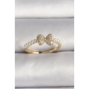Pirinç Gold Renk Zirkon Taşlı Fiyonk İnci Detay Ayarlanabilir Yüzük