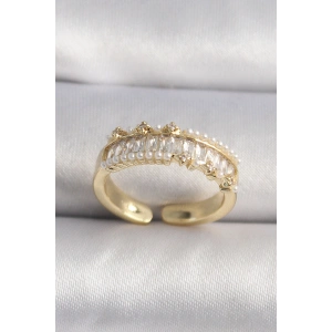 Pirinç Gold Renk Zirkon Taş Detaylı İncili Ayarlanabilir Yüzük