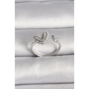 Pirinç Gümüş Renk Beyaz Mineli İnci Detaylı Kalp Model Ayarlanabilir Yüzük