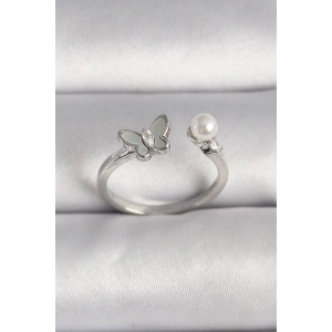 Pirinç Gümüş Renk Zirkon Taş Detaylı Beyaz Mineli Kelebek Figür İnci Detay Ayarlanabilir Yüzük