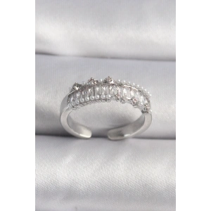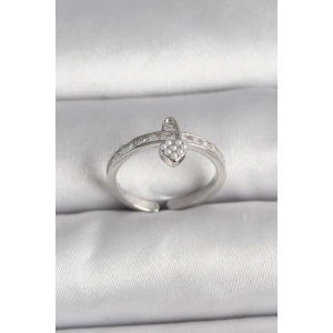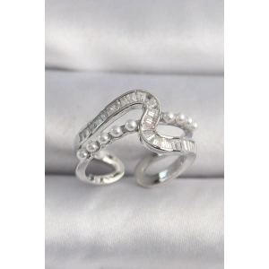 Pirinç Gümüş Renk Zirkon Taşlı Fiyonk İnci Detay Ayarlanabilir Yüzük