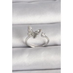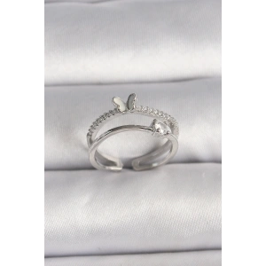 Pirinç Gümüş Renk Zirkon Taşlı Kelebek Figürlü Ayarlanabilir Yüzük