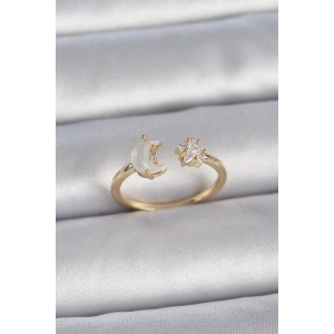 Pirinç Gold Renk İncili Hilal Zirkon Taşlı Yıldız Ayarlanabilir Model Kadın Yüzük