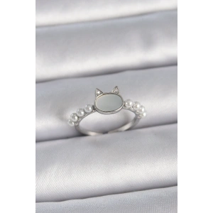 Pirinç Gümüş Renk Ayarlanabilir Beyaz Mineli Kedi Model İnci Detay Kadın Yüzük