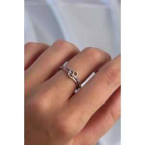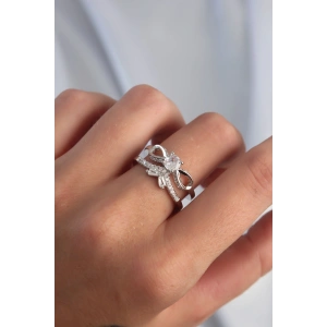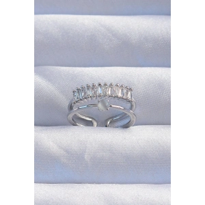 Pirinç Ayarlamalı Gümüş Renk Zirkon Taşlı 2li Görünüm Fiyonk Yüzük