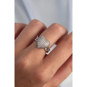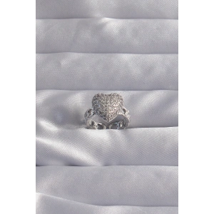 Pirinç Ayarlamalı Gümüş Renk Zirkon Taşlı Bombeli Kalp Yüzük