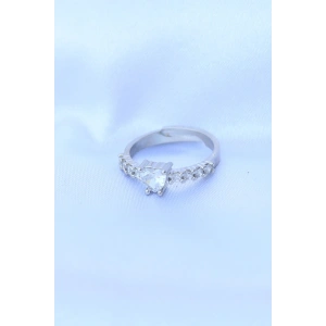 Pirinç Gümüş Renk Zirkon Taşlı Kalpli Model Ayarlanabilir Yüzük