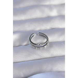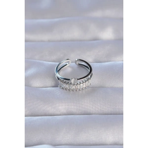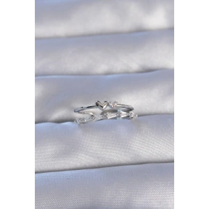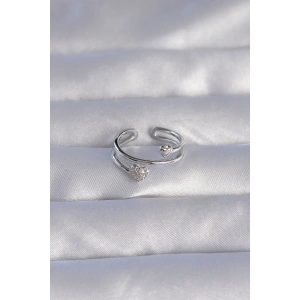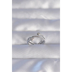 Pirinç Gümüş Renk Zirkon Taşlı Kalpli 2li Görünüm Ayarlanabilir Yüzük