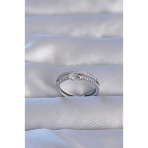 Pirinç Gümüş Renk Zirkon Taşlı Kalpli Su Yolu Model Ayarlanabilir Yüzük