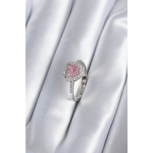 Gümüş Renk Zirkon Taşlı Pembe Kristal Kalp Model Kadın Yüzük