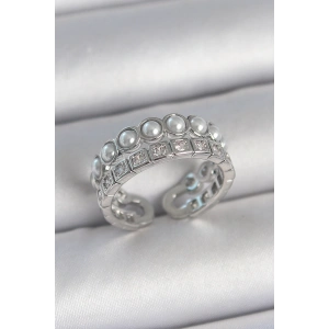 Pirinç Gümüş Renk 2'Li Sıra Zirkon Taşlı Ve İncili Ayarlanabilir Kadın Yüzük