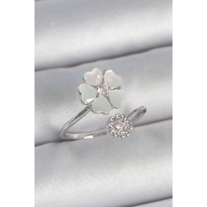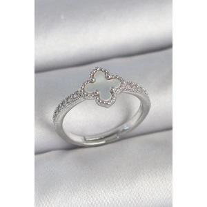 Pirinç Gümüş Renk Zirkon Taşlı Beyaz Mineli Yonca Model Ayarlanabilir Kadın Yüzük