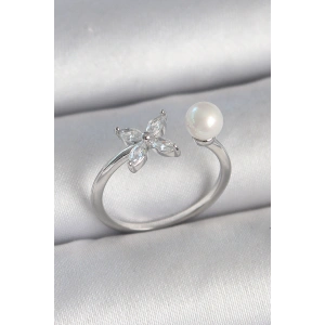 Pirinç Gümüş Renk Zirkon Taşlı Çiçek Model İnci Detay Ayarlanabilir Kadın Yüzük