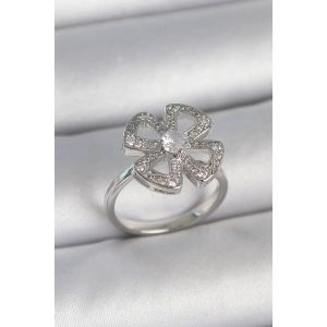 Pirinç Gümüş Renk Beyaz Mineli Çiçek Model Zirkon Taş Detay Kadın Yüzük