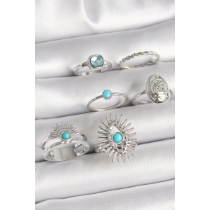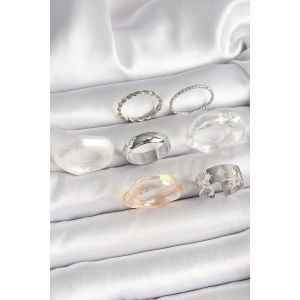 Pirinç Gümüş Renk Beyaz Akrilik Plastik Model Kutup Yıldız İşleme Detaylı Kadın Yüzük Kombini