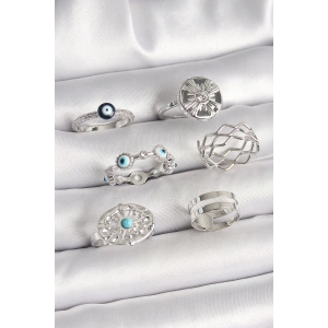 Pirinç Gümüş Renk Nazar Boncuk Detay İncili Kelebek İşlemeli Kadın Yüzük Kombini