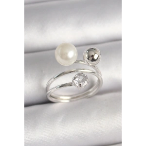Pirinç Gümüş Renk Zirkon Taşlı Toplu İnci Model Kadın Yüzük