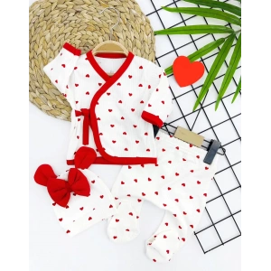 0-3 Ay Piti Kalp Desenli Şapkalı Patikli 3Lü Kız Bebek Takımı Ekru