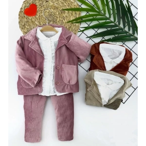 2-3-4-5 Yaş Düğme Kapamalı Fırfır Gömlekli Kadife Ceket Pantolon 3Lü Kız Bebek Takımı Bej