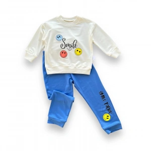 6-9-12-18 Ay Emoje Baskılı Pamuk Penye Kumaş Erkek Bebek Takımı Mavi