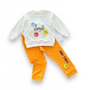 6-9-12-18 Ay Emoje Baskılı Pamuk Penye Kumaş Erkek Bebek Takımı Turuncu