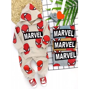 9-12-18-24 Ay Kapşonlu Örümcek Adam Baskılı Uzun Kollu 3Lü Kız Erkek Bebek Takımı Hardal