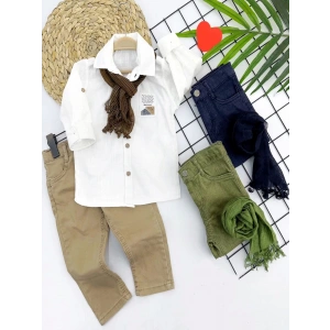 9-12-18-24 Ay Ve 3-4-5 Yaş Fularlı Pamuk Keten Gömlekli Pantolonlu 3Lü Erkek Bebek Takımı Bej