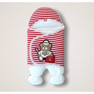 Yenidoğan Dr. Ayıcık Nakışlı Kız-Erkek Bebek Ayaklı Kundak Bebek Battaniyesi Kırmızı