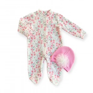0-3-6-9 Ay Çiçek Baskılı Tam Boy Çıtçıtlı Patikli Güllü Boneli Kız Bebek Tulumu Pembe