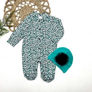 0-3-6-9 Ay Leopar Baskılı Tam Boy Çıtçıtlı Patikli Güllü Boneli Kız Bebek Tulumu Turkuaz
