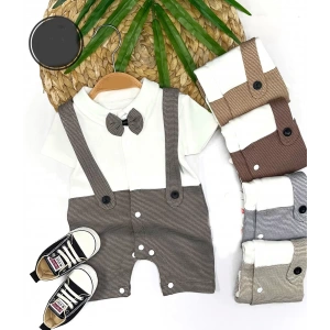 3-6-9-12 Ay Papyon Detaylı Piti Kare Baskılı Salopet Görünümlü Erkek Bebek Tulumu