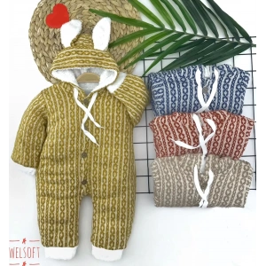 6-9-12-18 Ay Düğme Kapamalı Kulaklı Kapşonlu Triko Kumaş Kız Erkek Bebek Tulumu Sarı