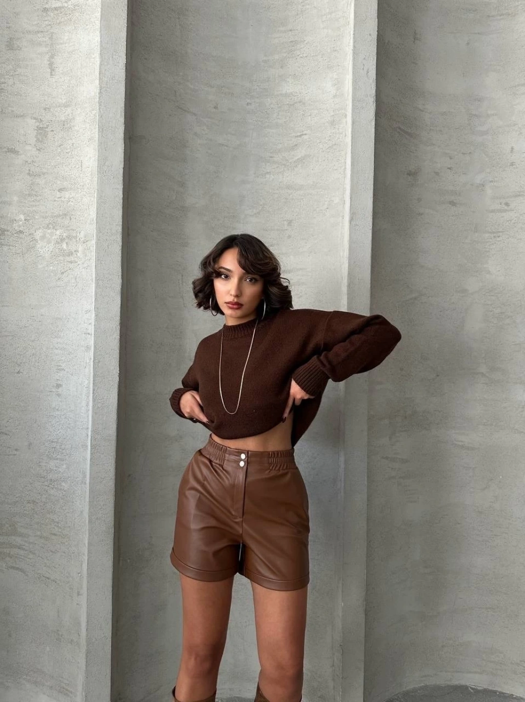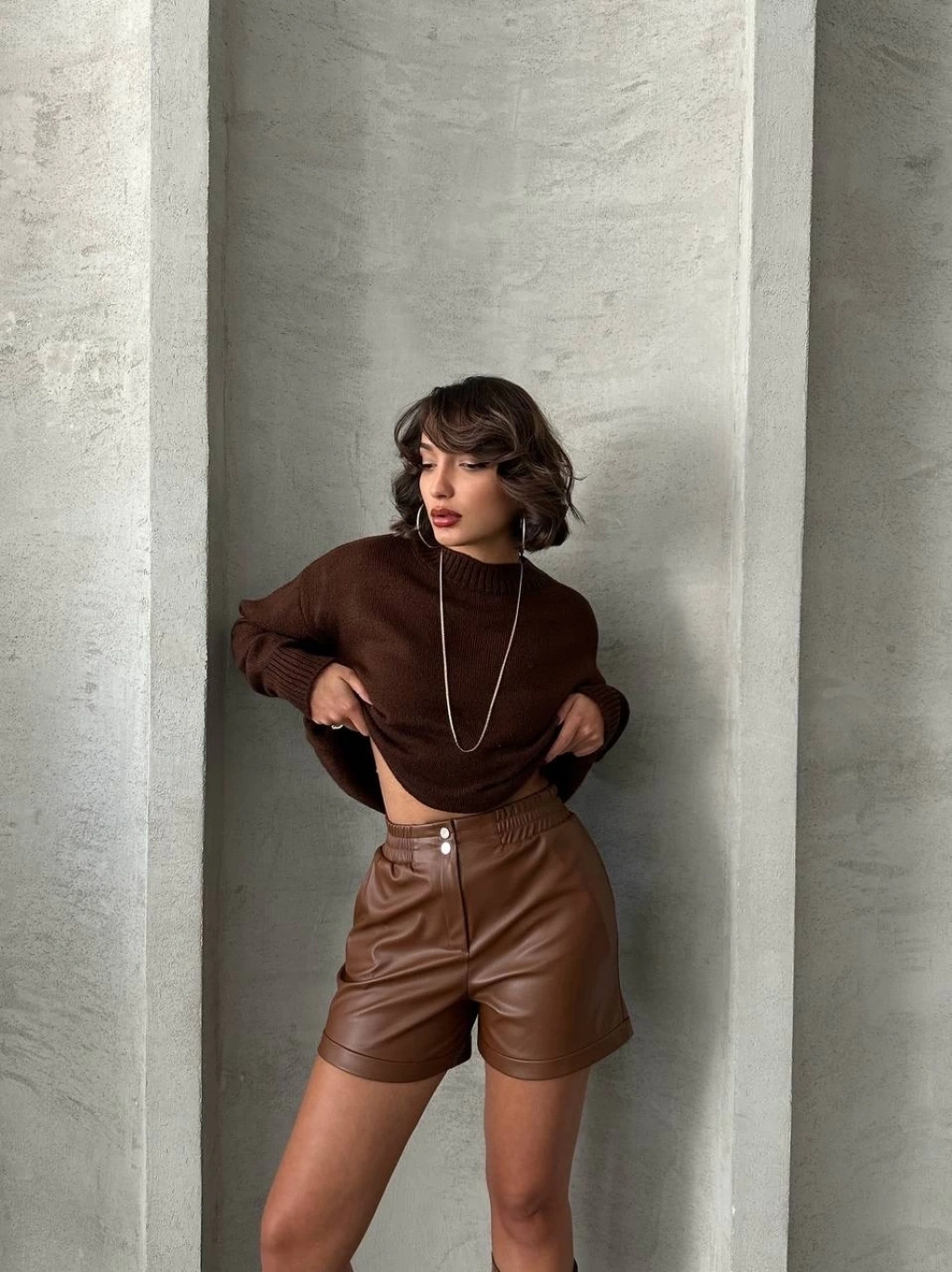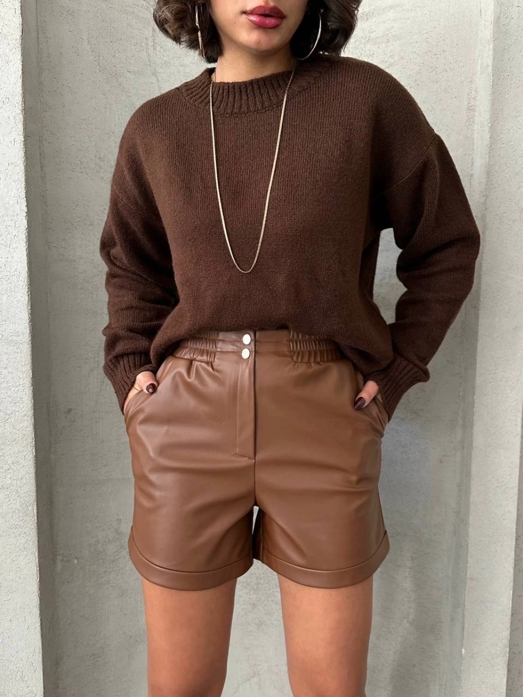 Çift fermuarlı deri şort kahve h24394