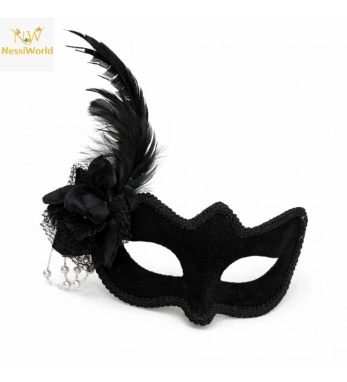 Beyaz İnci Detaylı Siyah Süet Venedik Kadın Maskesi Tüylü Güllü