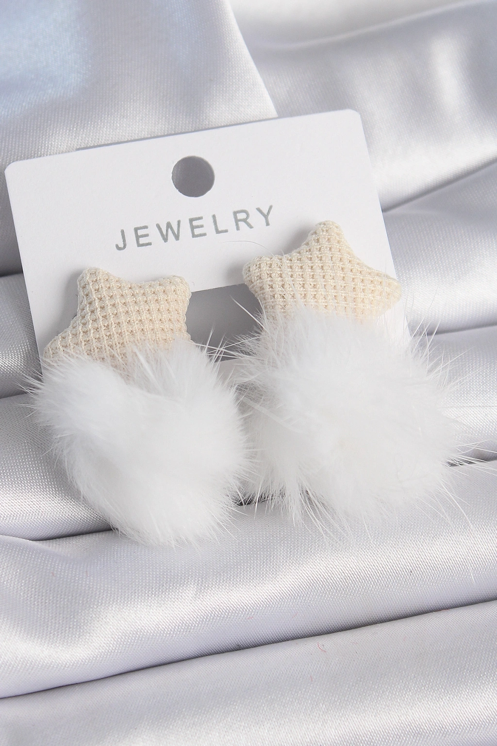Beyaz Renk Tüylü Yıldız Ponpon Model Kadın Küpe