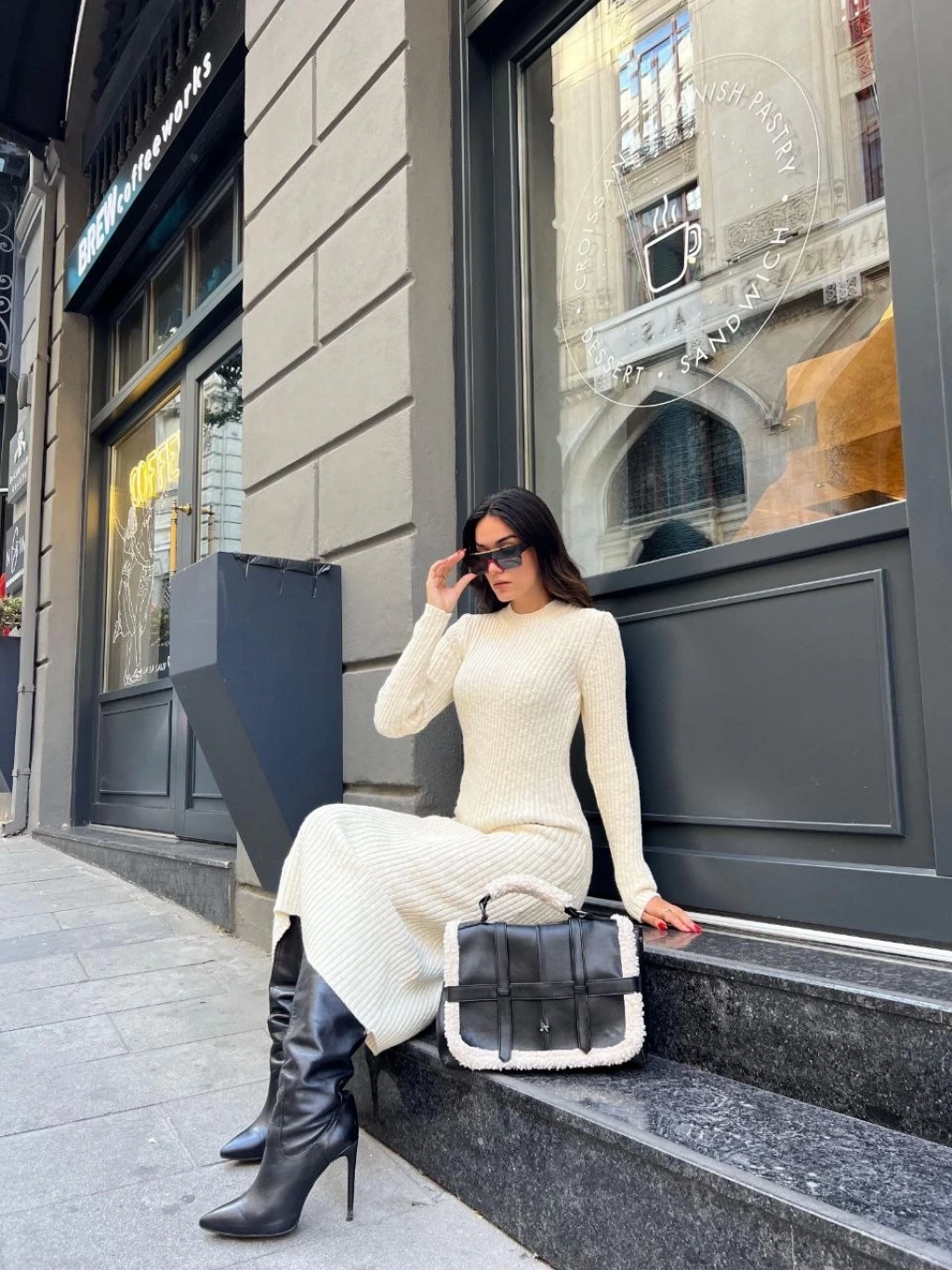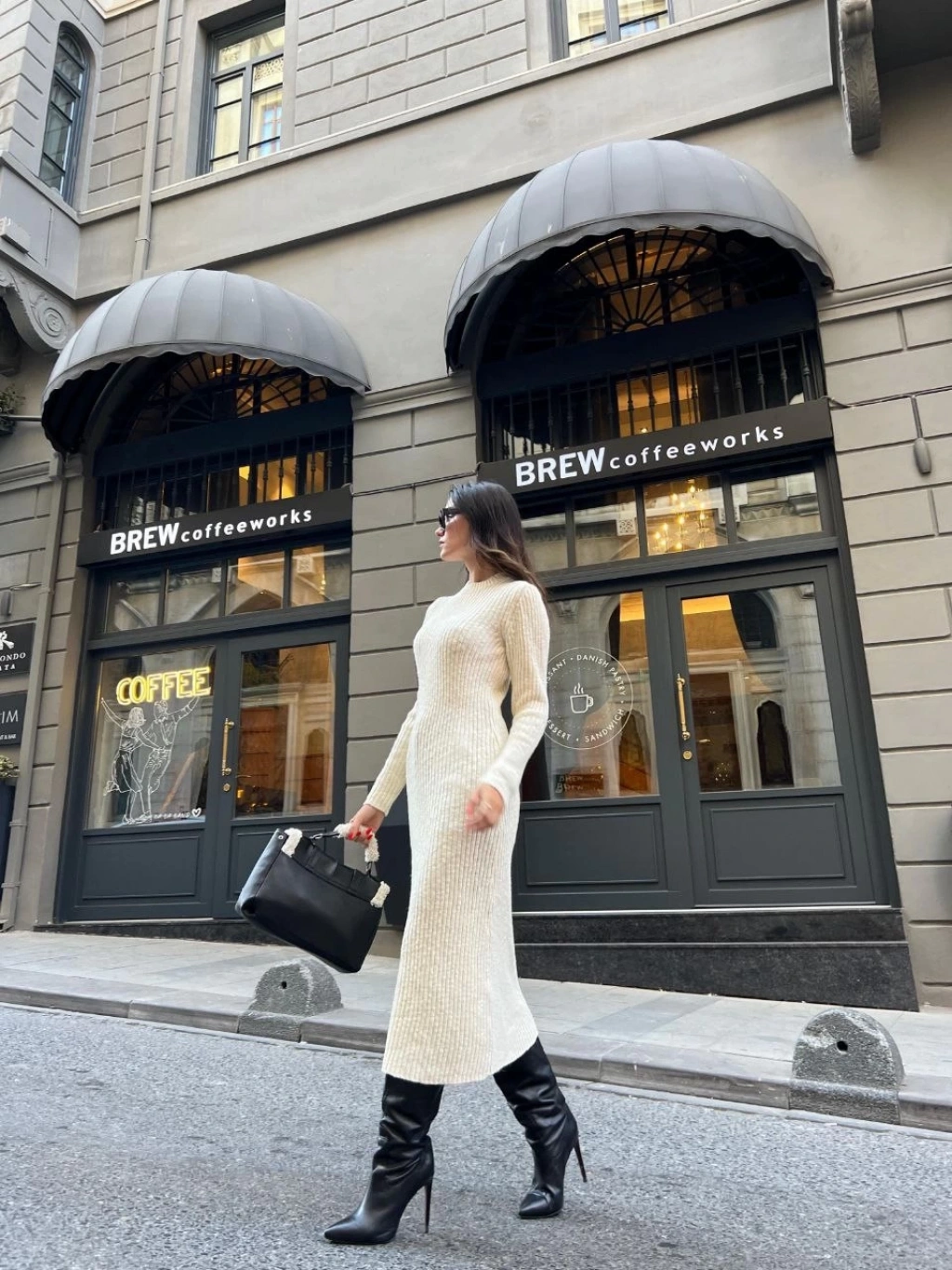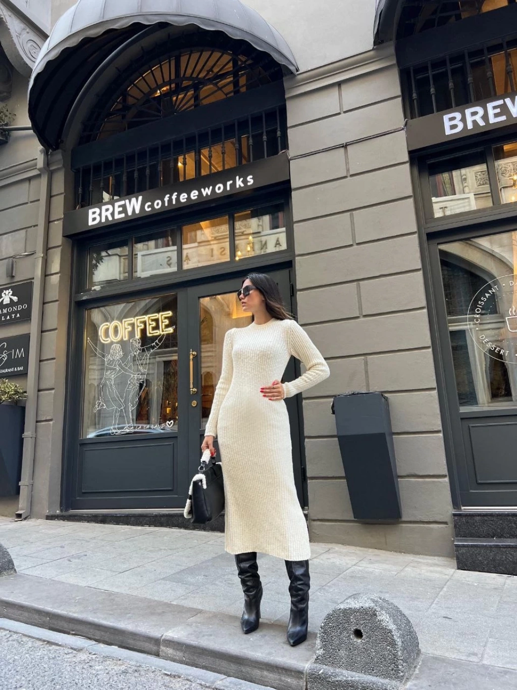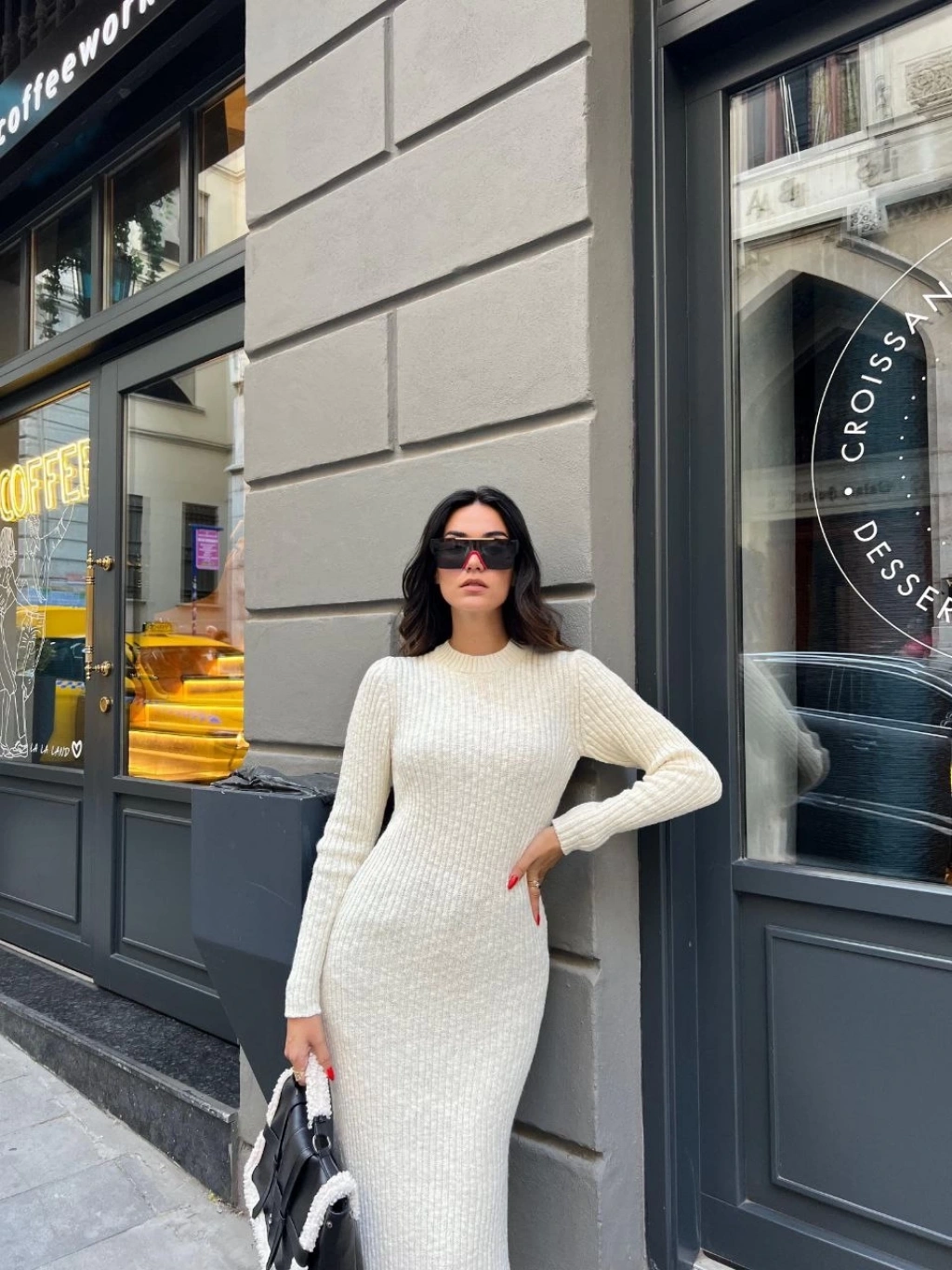 Kadın Boğazlı Triko Elbise – Uzun Fitilli Esnek Dokuma, Tam Kalıp, Kışlık & Baharlık Şık Rahat Stil, 130 cm Midi Boy Elbise - Beyaz