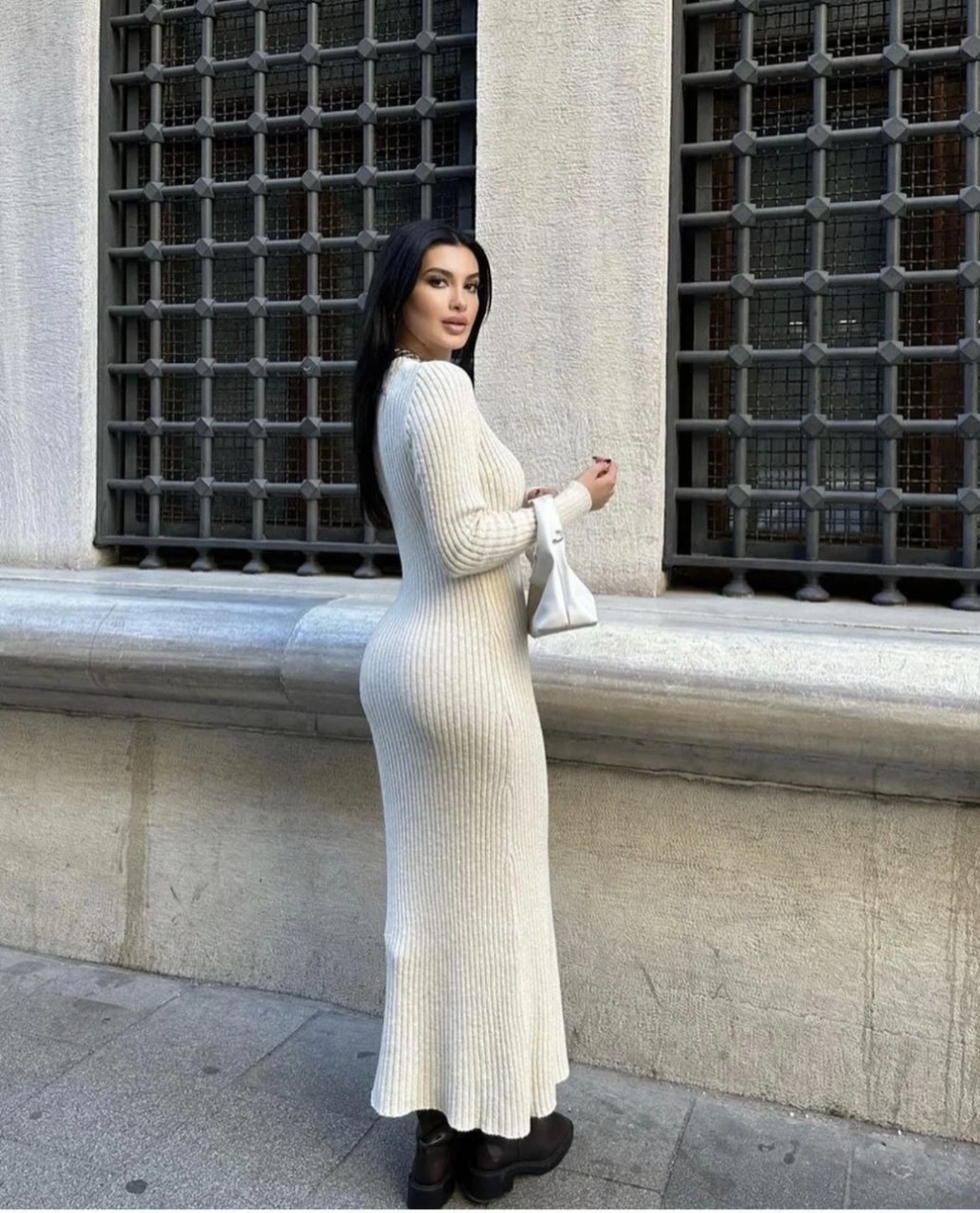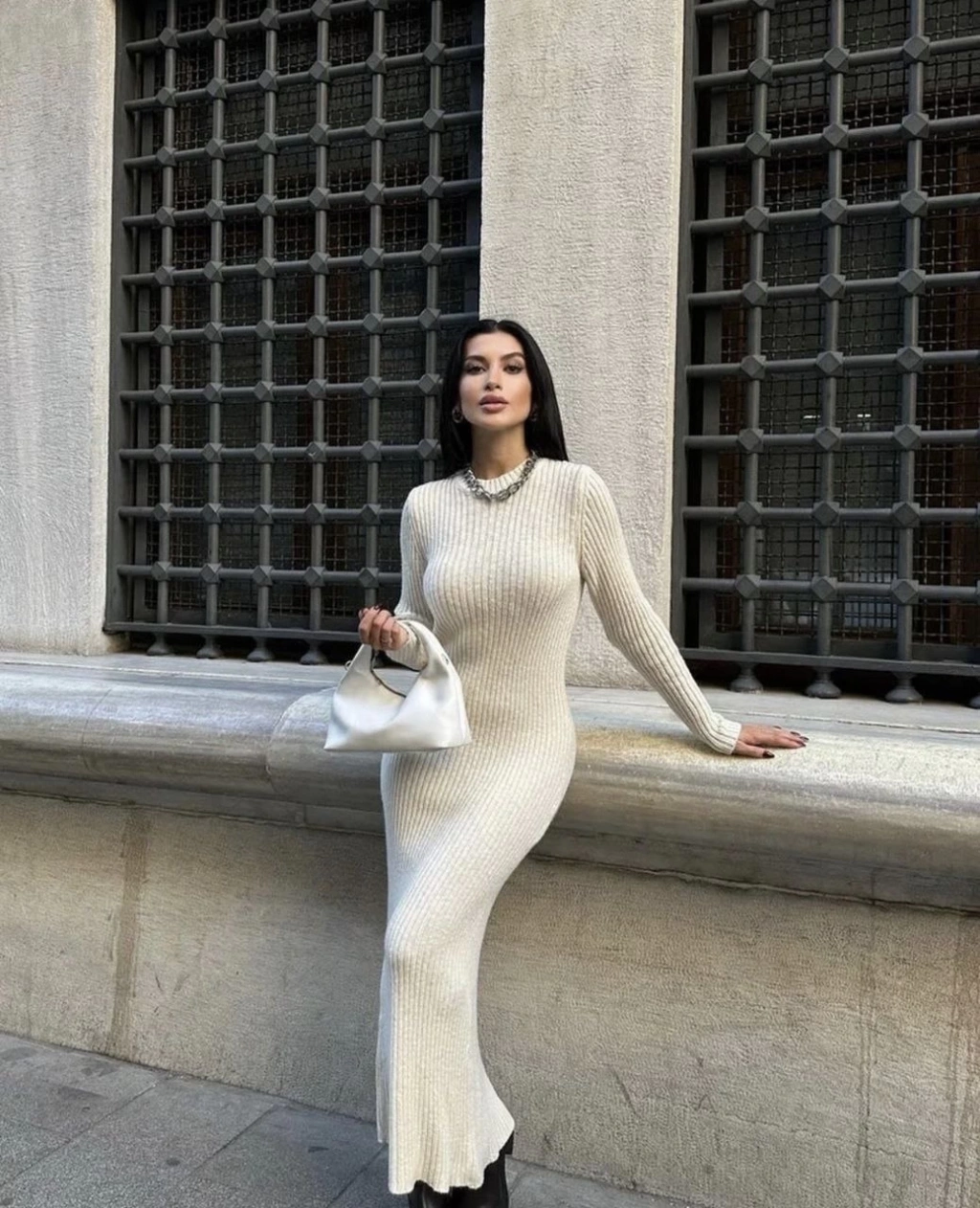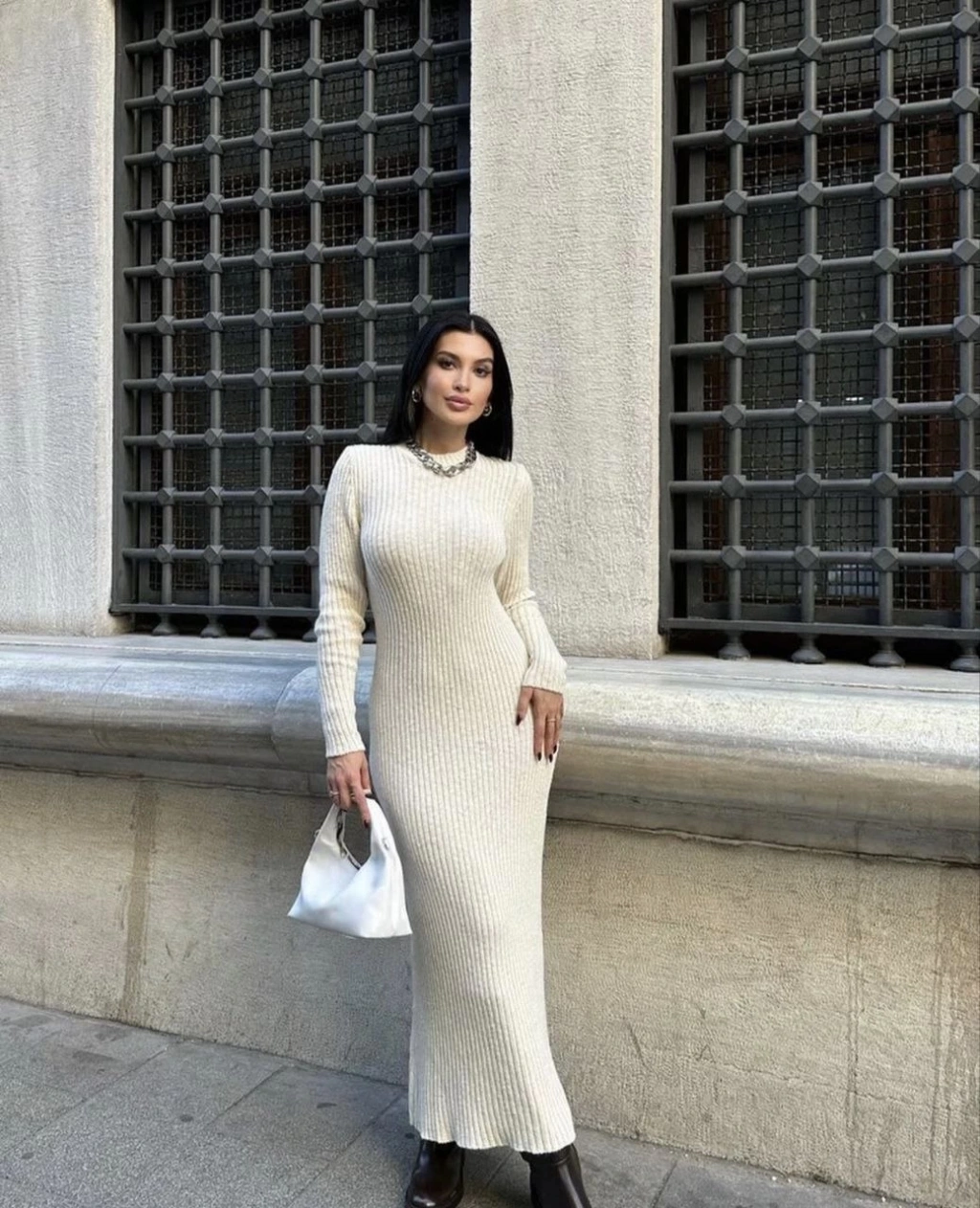 Kadın Tesettür Triko Elbise – Boğazlı Uzun Fitilli Dokuma, Esnek Tam Kalıp, 130 cm Midi Boy, Bahar & Kış Şık Rahat Stil - Beyaz